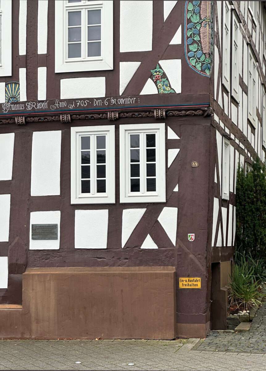 Detail eines reich verzierten Fachwerkhauses in Bad Laasphe mit Inschrift von 1705 und buntem Schmuckfries