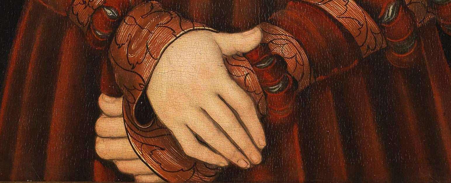 Um Leonardo nicht zu sehr zu verärgern, muss ich anerkennen: Die Hände der Mona Lisa sind ihm um Welten besser gelungen. Die entspannte Überlagerung der Finger, die natürliche Weichheit – das ist meisterlich. Cranachs Hände hingegen erinnern noch an mittelalterliche Darstellungskonventionen. Der Daumen der oberen Hand wirkt ungelenk und zu dick. Hier zeigt sich, dass Cranach in der Handmodellierung nicht an Leonardos Perfektion herankam.