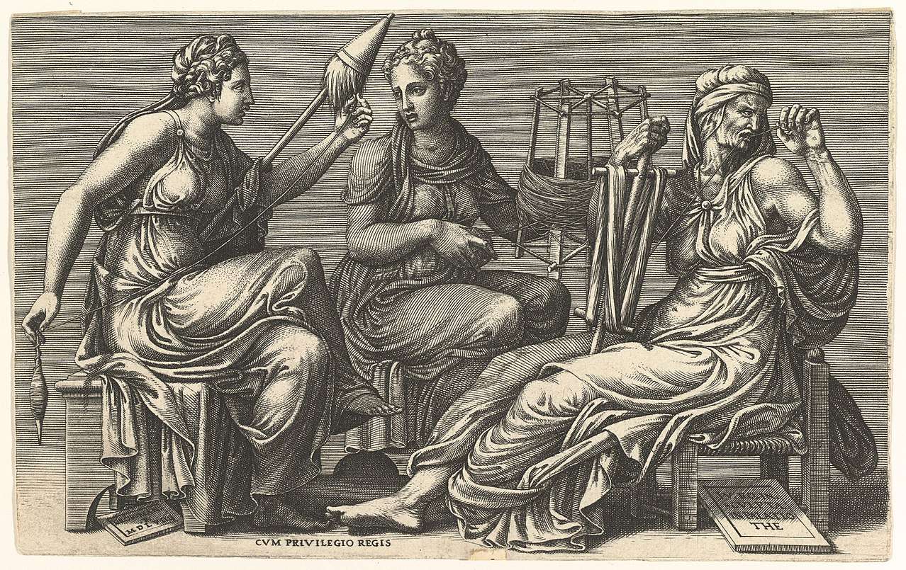 Während Ariadne die Kunstgeschichte mit einem orientierenden Faden bereichert, spinnen die Parzen – Clotho, Lachesis und Atropos – gleich das ganze Leben. Sie ziehen den Faden des Menschen aus einem unendlichen Dunkel, messen ihn sorgfältig ab und schneiden ihn zu gegebener Zeit ab.
