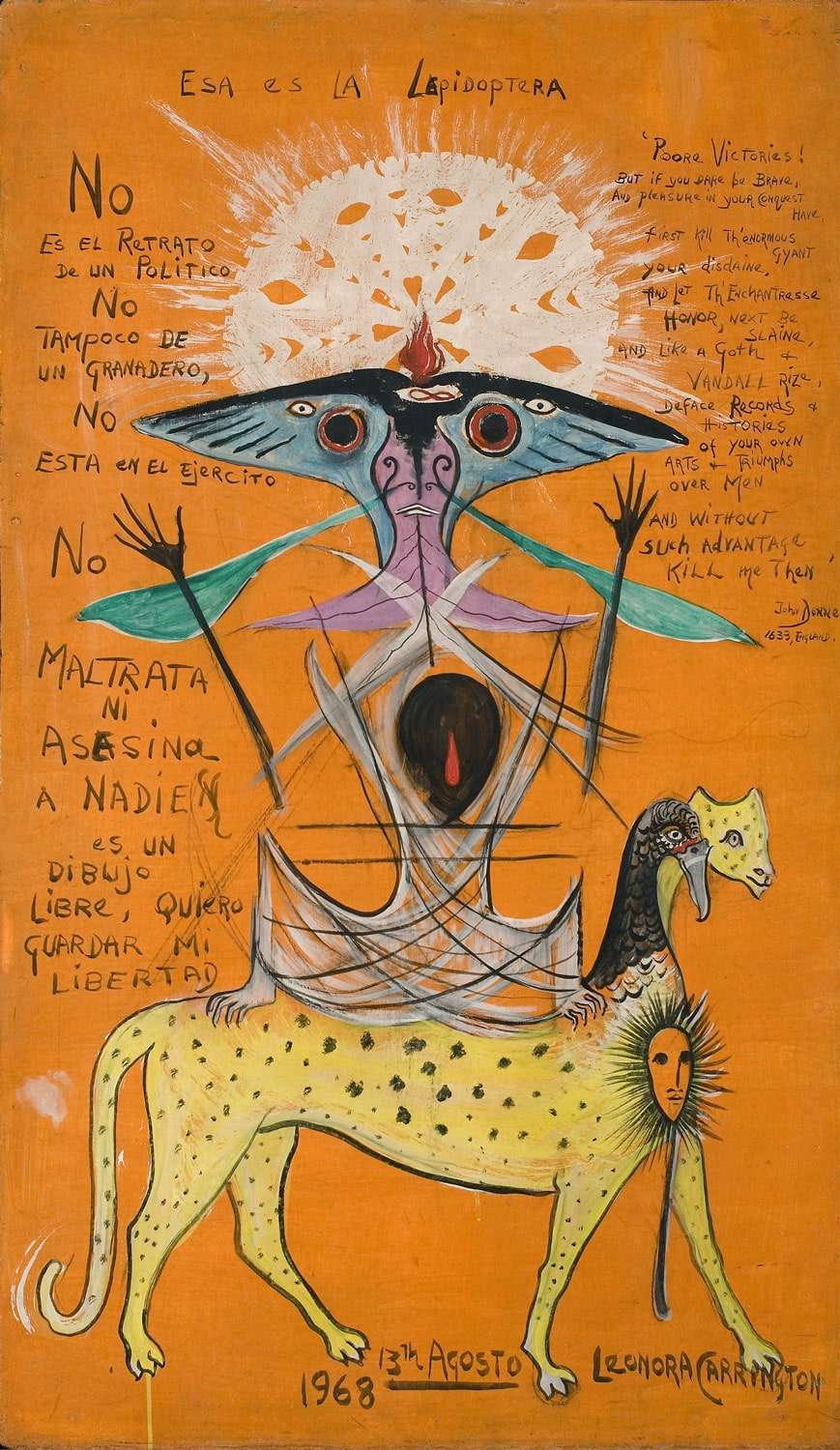 Die britisch-mexikanische Künstlerin Leonora Carrington (1917–2011) schuf 1968 das Bild L’epidoptera. Eine zentrale Schmetterlingsfigur verbindet sich mit Textfragmenten, die eine klare Botschaft formulieren: