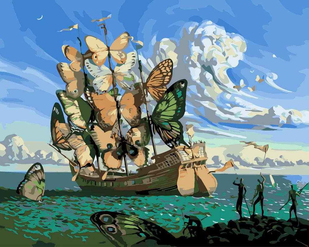 In Ship with Butterfly Sails (1937) verwandeln sich die Segel eines Schiffs in riesige Schmetterlingsflügel. Wind und Leichtigkeit verschmelzen mit der Vorstellung von Traum und Reise.