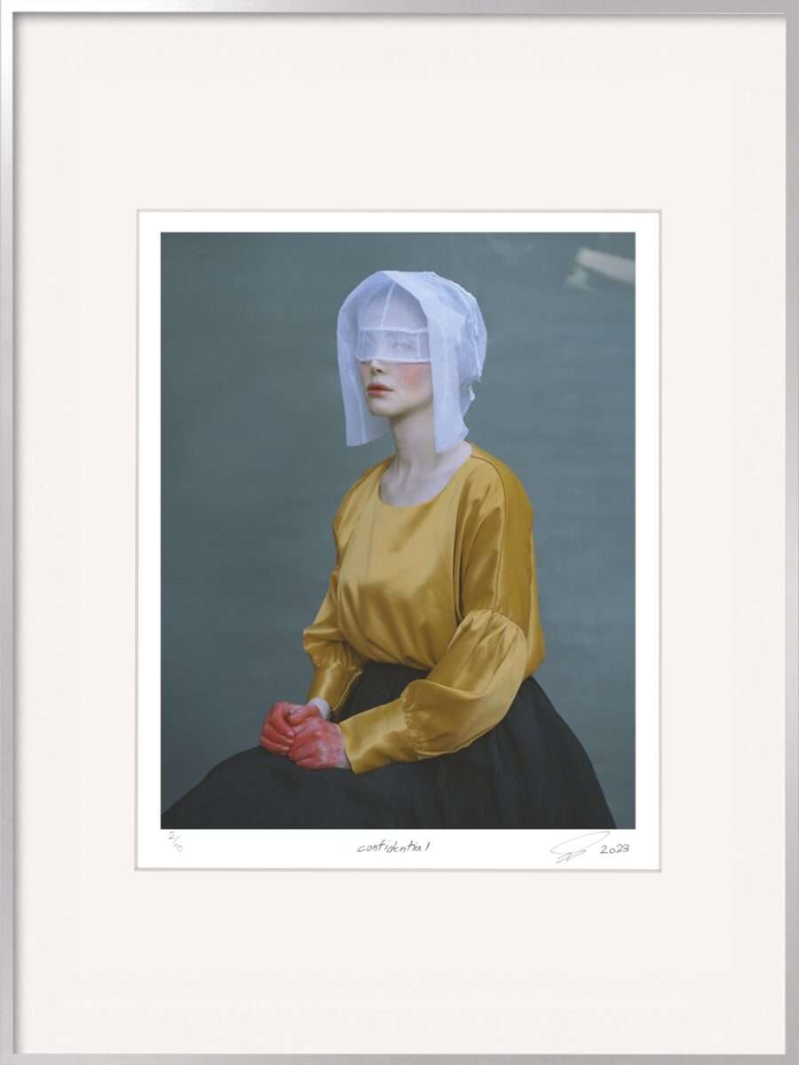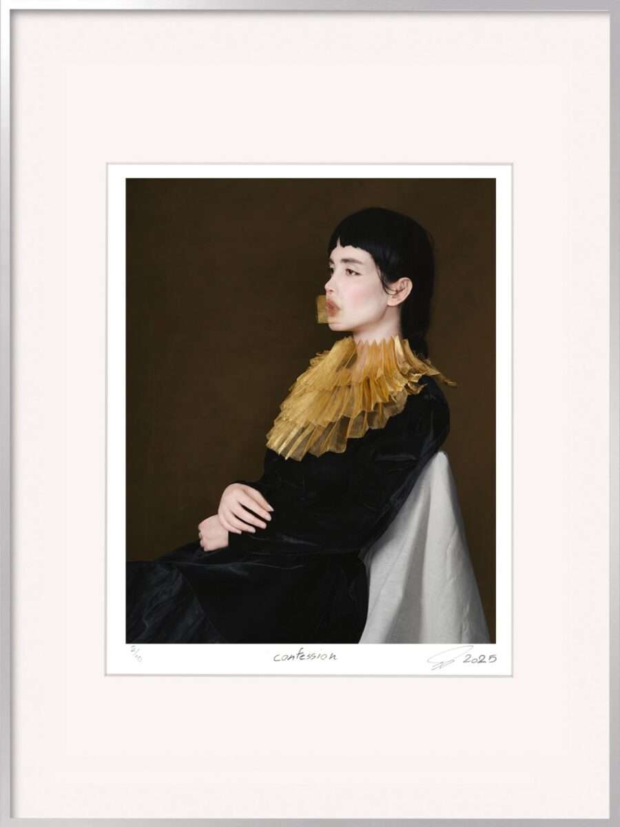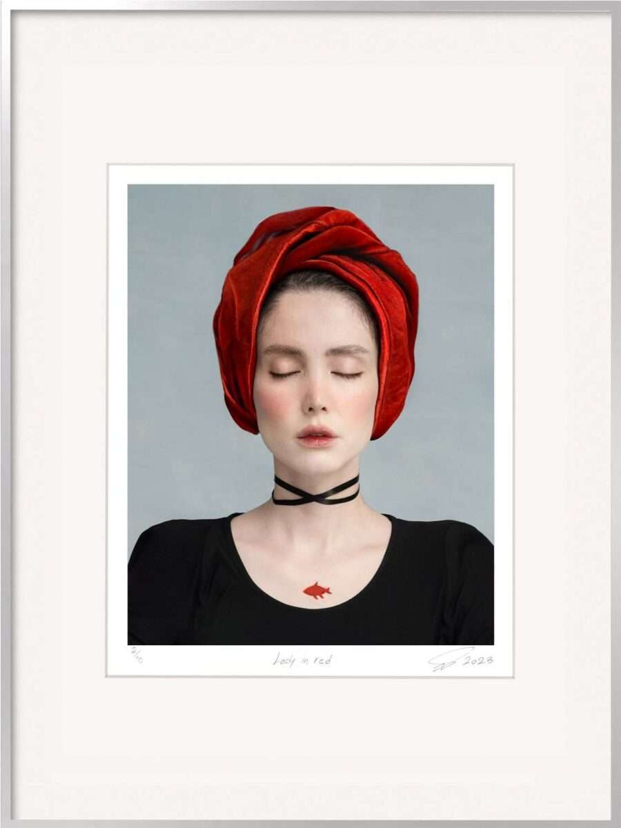 In diese Traditionslinie reiht sich die iranische Künstlerin Somy Samani mit ihrer Fotografie Lady in Red. Auf den ersten Blick wirkt die Aufnahme formal ruhig: eine junge Frau mit geschlossenen Augen, das Gesicht bleich, fast maskenhaft, umhüllt von einem roten Tuch. Doch die Ruhe täuscht.