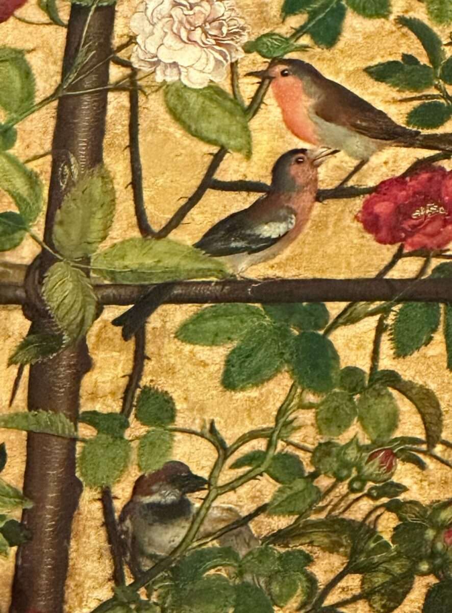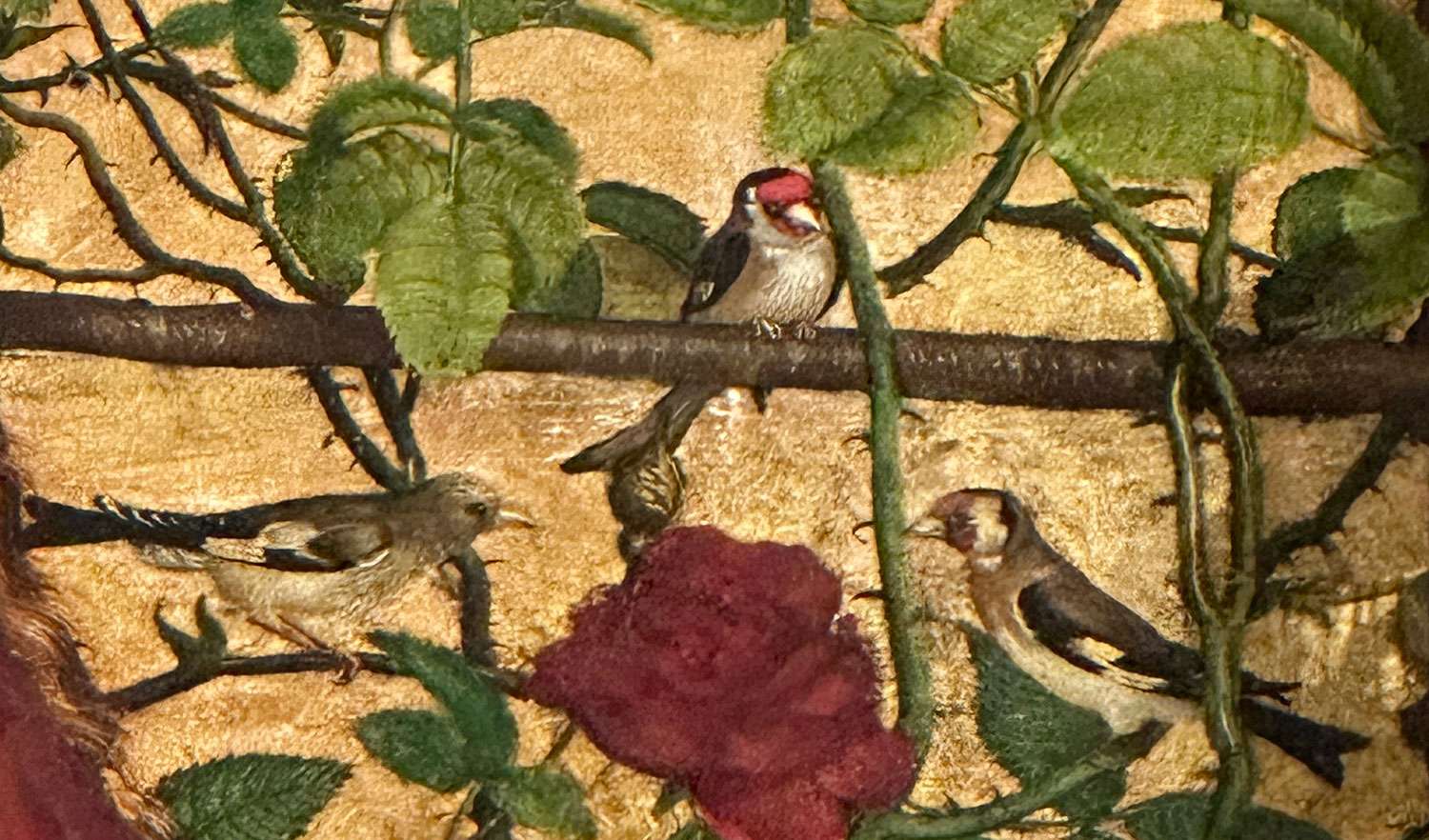 Maria sitzt im (auf dem unverstümmelten Gemälde vermutlich ummauerten) Rosengarten, umgeben von einem filigranen Rankwerk, so fein, dass die Natur sich selbst übertreffen müsste, wollte sie es exakt kopieren. Der Hortus conclusus – der verschlossene Garten – ist seit dem Mittelalter ein Symbol der Reinheit. Doch Schongauer belässt es nicht bei Symbolik. Er füllt den Garten mit echtem Leben: mit Rotkehlchen, Buchfinken, Kohlmeisen, Stieglitzen und sogar einem Zilpzalp, der hier tatsächlich – wie in der Natur – so gut versteckt sitzt, dass man ihn beinahe übersieht.