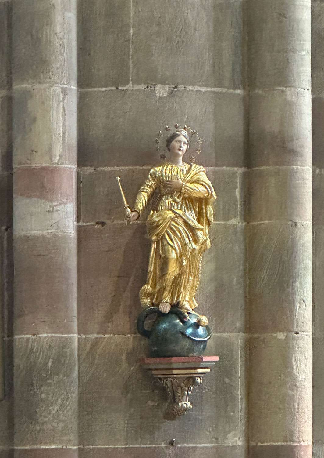An der Wand steht diese Figur – ruhig, fast beiläufig. Maria als Immaculata, auf der Weltkugel stehend und die Schlange zertretend. Die Form ist klar, die Aussage ebenso: oben die erhobene Gestalt, darunter das, was überwunden wird.