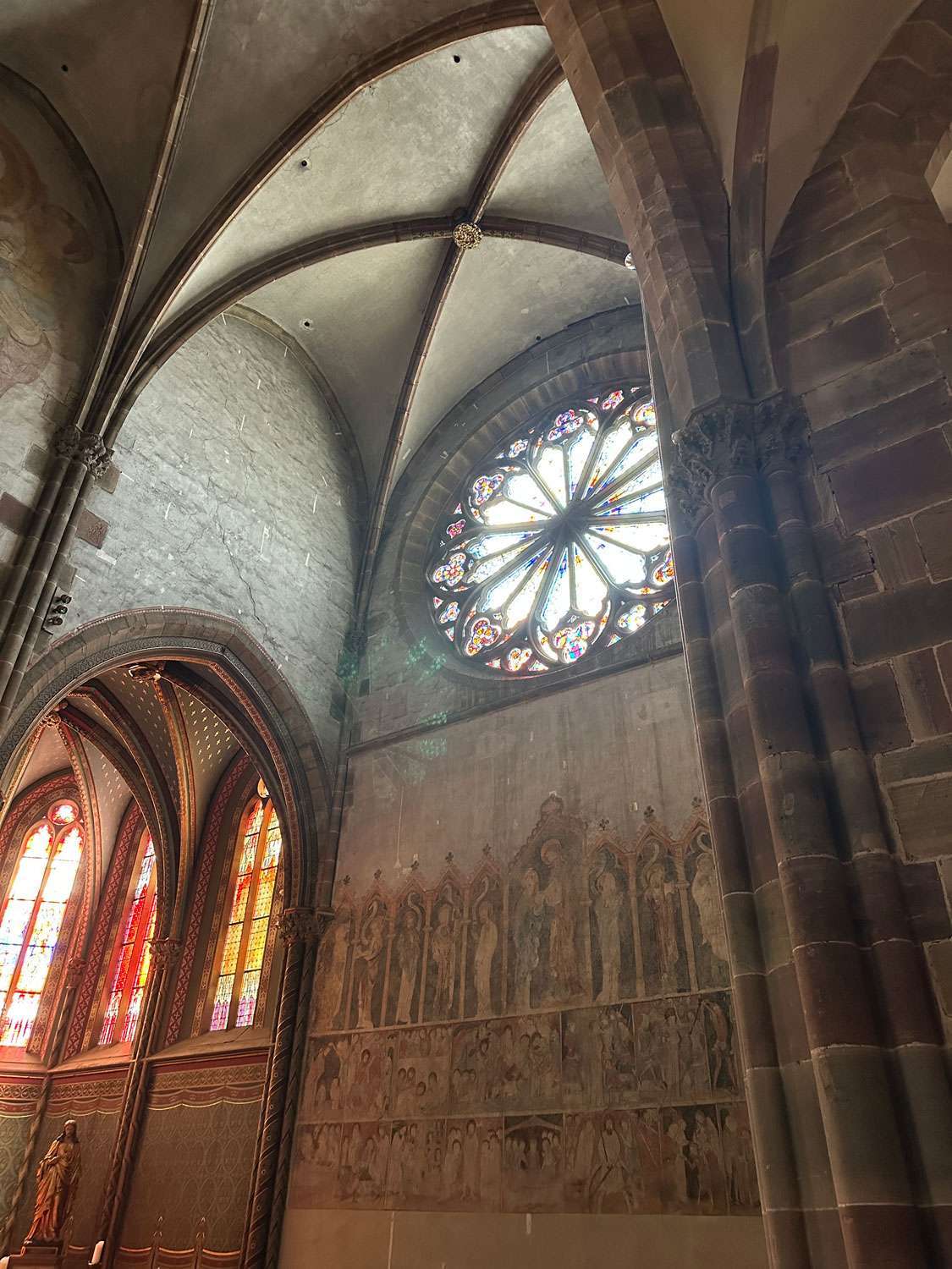 Unter dem Fenster sind Reste mittelalterlicher Wandmalerei zu sehen. Sie wirken heute blass, fast zurückgenommen. Doch gerade das macht ihren Reiz aus. Das Licht der Rose, die Pfeiler, das Gewölbe und die Malerei erzählen gemeinsam davon, dass diese Kirche nicht nur gebaut, sondern über Jahrhunderte immer wieder weitergeschrieben wurde.