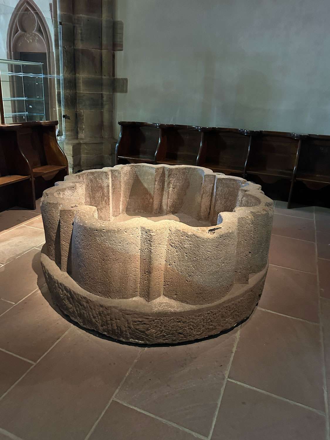 Dieses Taufbecken wirkt auf den ersten Blick fast grob – ein massiver Block aus Stein, schwer, ruhig, ohne jede Zier. Und doch ist es genau gearbeitet. Die runde Form wird durch tiefe Einschnitte gegliedert, die sich nach innen öffnen. Nichts ist dekorativ gemeint, alles folgt der Funktion.