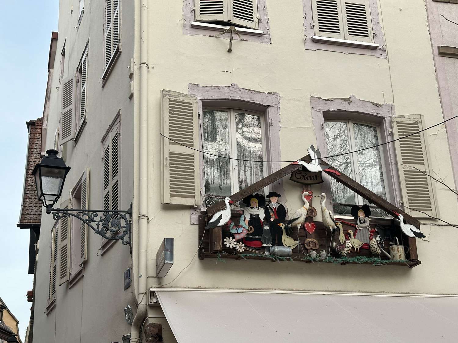 Colmar hat diese Fassaden, die man nicht „besichtigt“, sondern irgendwann bemerkt. Man läuft unter ihnen hindurch wie unter einem Dach aus Geschichte. Fachwerk, helle Felder, Fensterläden, die offenstehen, als würde gleich jemand hinausschauen. Und dann: die irritierenden Figuren.