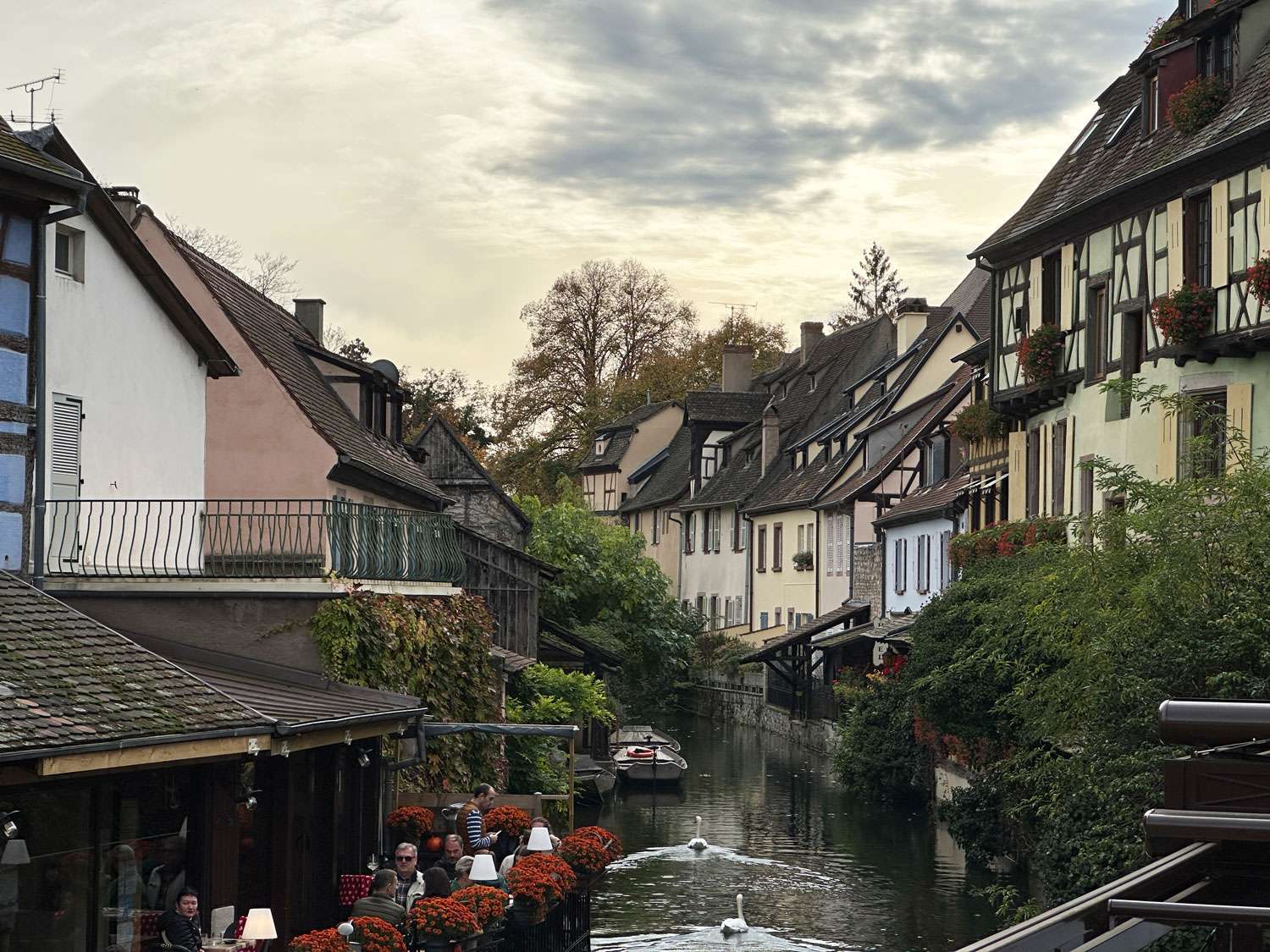 Die Schwäne treiben durch das Bild wie ein ruhiger Kommentar. Sie gehören längst dazu, so wie das leise Stimmengewirr von den Tischen. Wer einen Tagesausflug nach Colmar macht, merkt hier, dass das französische Lebensgefühl weniger mit Sehenswürdigkeiten zu tun hat als mit dem selbstverständlichen Nebeneinander von Alltag und Geschichte. Man sitzt, man schaut, man bleibt einen Moment länger als geplant. NUR. Es sitzen eher Touristen als Franzosen hier. Zumindest am Tage.